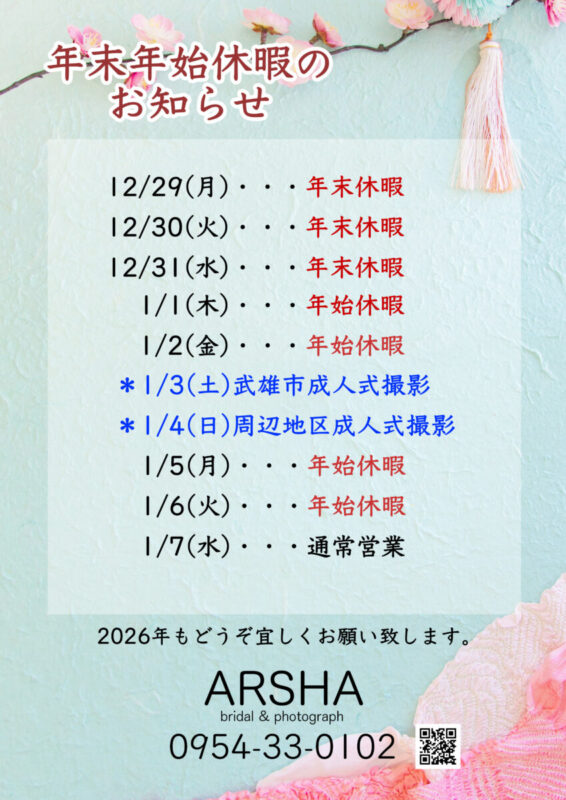 年内は12/28(日)まで、年明けは1/7(水)より通常営業となります。